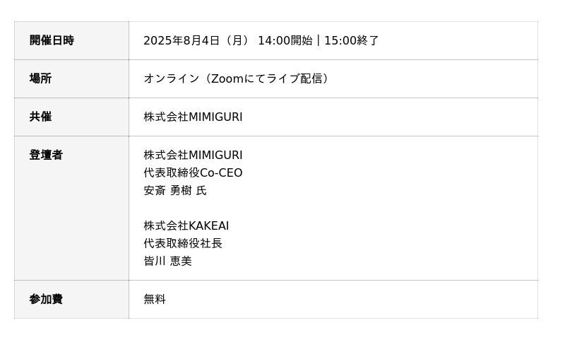 1on1ミーティングをはじめとする面談サポートシステム「Kakeai(カケアイ)」を開発・運営する株式会社KAKEAI(本社:東京都渋谷区 代表取締役社長 皆川恵美、以下KAKEAI)は2025年8月4日(月)にオンラインセミナー「組織変革のための1on1 リ・デザイン」を開催することをお知らせします。