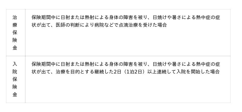 「熱中症のほけん」では、保険期間中に日射または熱射による身体の障害を被り、医師の判断により日本国内の病院などで点滴治療を受けた場合や、治療を目的とする継続した2日(1泊2日)以上の入院を日本国内の病院などで開始した場合に、保険金が支払われます。保険料は、日単位契約の場合1日100円から加入でき、月単位契約の場合でも、月額200円からのお手頃な保険料での申し込みが可能です。また、午前9時までに申し込むと、当日午前10時から保障がスタートするため、炎天下でのスポーツや各種作業など、熱中症リスクが高まると想定される場合でも、その日の朝に保険に加入できます。