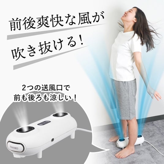 前後2つの吹き出し口から最大風速15m/sのパワフルな風が吹き抜け、身体の前も後ろも一気に涼しくしてくれます。