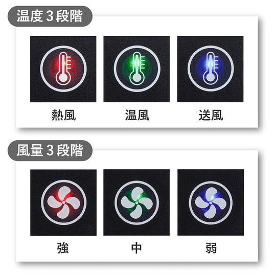 風量は「弱・中・強」の3段階、温度も「送風・温風・熱風」の3段階で調節ができます。
