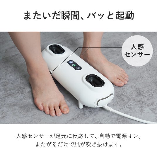 本体に内蔵された人感センサーが足元を感知し、またがるだけで自動で送風を開始します。