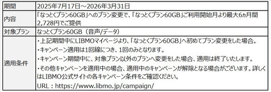 期間中に「なっとくプラン60GB」でLIBMO新規利用されるお客様と、LIBMOご利用中で「なっとくプラン60GB」にプラン変更をされるお客様を対象に、月額基本料金を最大6ヵ月割引するキャンペーンを実施いたします。新規ご加入の方だけでなく、既にLIBMOをご利用中の方にも、日頃の感謝を込めて60GBプランへの変更でキャンペーンを適用いたします。