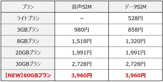 なっとくプラン60GB 3,960円/月(音声SIM/データSIM)