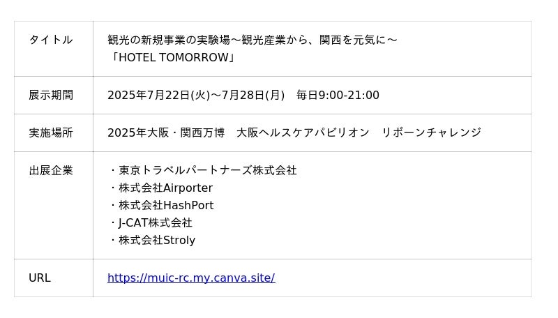 一般社団法人関西イノベーションセンター(大阪府大阪市、理事長 早乙女 実(そうとめ みのる)、以下当社団)は、2025年大阪・関西万博の大阪ヘルスケアパビリオン内「展示・出展ゾーン」のリボーンチャレンジにおいて、近未来の観光をコンセプトにした「HOTEL TOMORROW」の展示を行う事をお知らせいたします。観光産業における課題解決を行うスタートアップ5社の技術やソリューションに関する展示を通じて、来場者に対し未来の旅行体験を提案します。