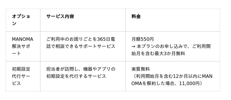 機器の設置や初期設定を専任スタッフが代行する「初期設定代行サービス」、機器のトラブル時に電話で相談できる「MANOMA解決サポート」など、選べるサポートオプションも充実しています。