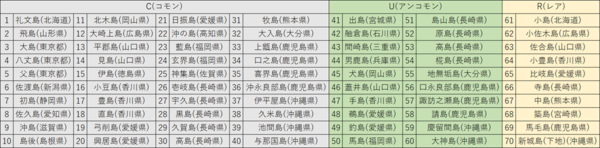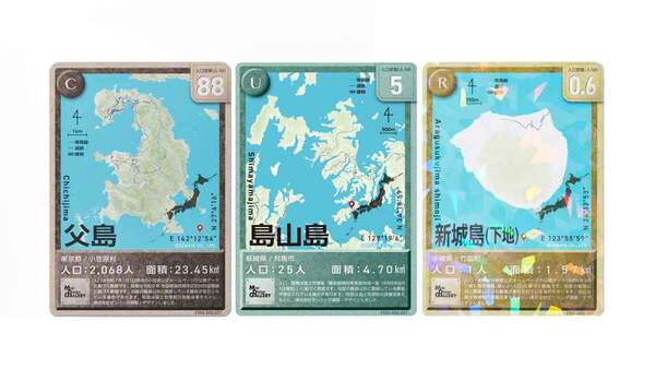 収録カードは全70島で、人口の数値に応じてレア度を設定している点がユニークだ。人口100人以上の「C(コモン)」が40島、10人~99人の「U(アンコモン)」が20島、そして1人~9人の「R(レア)」が10島という構成で、Rカードの表面には光り輝く加工が施されている。また、裏面のシルエットを見て島名を当てる「離島シルエットクイズ」としても楽しむことができる。
