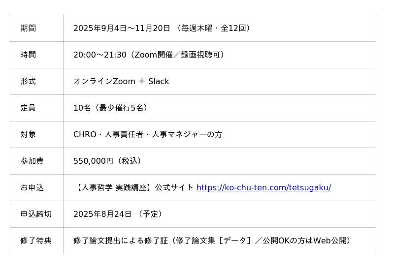「人と事、現場と経営、短期と長期──葛藤の多い人事に、いま必要なのは『哲学』だ!」CHRO・人事責任者・人事マネジャーの方を対象としたオンライン講座(全12回)の募集開始!