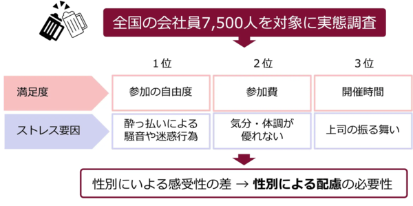 ・ストレス要因は「酔っ払いの迷惑行為」「体調不良で参加」「上司の振る舞い」