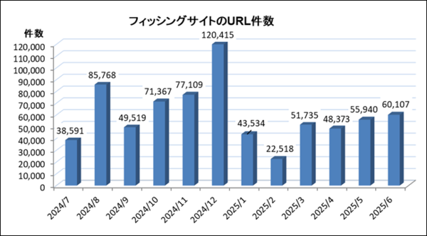 次に、フィッシングメール/SMSの誘導先(偽Webサイト)にあたる「URL件数(重複なし)」は6万107件で、前月から4167件増えました。
