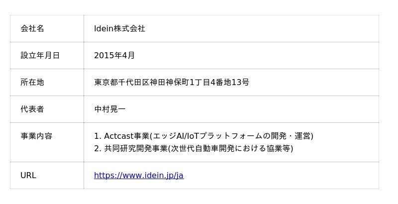 Idein(イデイン)は、エッジAI/IoTプラットフォーム「Actcast(アクトキャスト)」の提供を通じて、現場のあらゆるシステムやプロセスがソフトウェアにより、柔軟にアップデートされる世界を創り、社会の発展の加速を目指すスタートアップ企業です。エッジAIは、現場のデバイス側で処理を実行し、必要最小限のデータのみをクラウドへ送信する仕組みにより、クラウドAIが抱えるプライバシー保護や通信・サーバーコストの課題を解決するとして昨今ニーズが高まっています。また、「Actcast」はAIカメラやAIマイクなど現場に設置された多数のデバイスを遠隔で一元管理・運用できるプラットフォーム機能を備えており、エッジAI技術を活用した、さまざまなDXソリューションの低コストかつ迅速な導入を支援します。すでに、都市・交通、小売・外食、広告、製造など多様な現場データに対応し、幅広い業態において豊富な導入・共創実績があります。