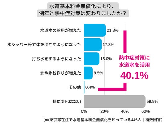 東京都在住者を対象とした調査では、今夏東京都で実施されている「水道基本料金の無償化」について、68.3%とおよそ7割が知っていると回答しました。この制度は、物価高騰による暮らしへの不安から、夏場に都民がエアコンなどの使用を控えてしまわないよう、水道光熱費をトータルで下支えする目的で実施されています。また、無償化を知っている人のうち40.1%は「水道水の飲用が増えた」「水シャワー等で体を冷やすようになった」「打ち水をするようになった」「氷や氷枕作りが増えた」など、水道水自体を積極的に活用して熱中症対策を行っている実態が明らかになりました。光熱費支援という枠組みの中で、水道水の活用を暮らしの中で見直し、熱中症予防に役立てる動きが広がりつつあります。