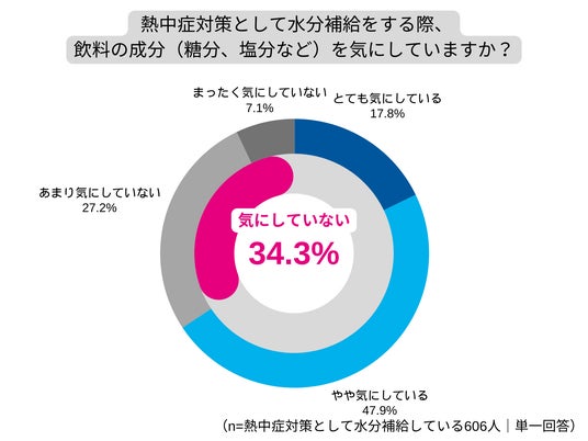 加糖の飲料で水分補給をした際、「喉が渇く」「倦怠感・疲労感」「頻尿・多尿」「集中力低下」「頭痛」といった、ペットボトル症候群の症状の一例として挙げられることがある体調の変化を感じたことがある人は、56.1%と半数を超えました。また、水分補給時に飲料の成分(糖分、塩分など)を「気にしていない」と回答した人は全体の34.3%と3分の1以上にのぼりました。