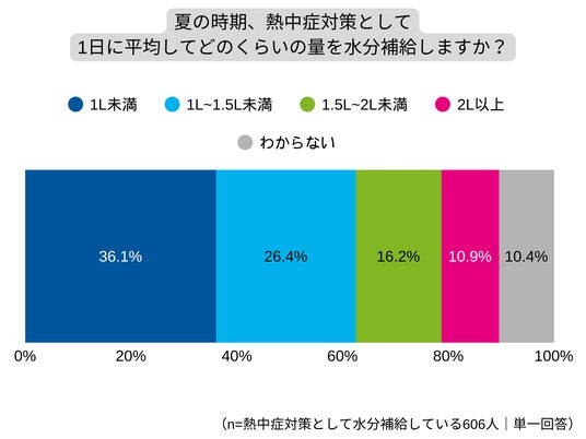 夏場の熱中症対策として1日に平均してどのくらいの量の水分を補給しているかを尋ねたところ、「1L未満」が36.1%と最も多く、次いで「1L~1.5L未満」(26.4%)、「1.5L~2L未満」(16.2%)、「2L以上」(10.9%)という結果でした。2L以上の水分補給をしている人は1割程度とごくわずかであることがわかります。
