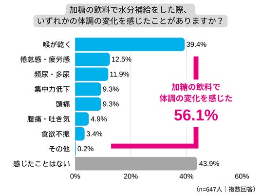 ・半数以上が加糖飲料で水分補給をした際に体調の変化を感じたことがある