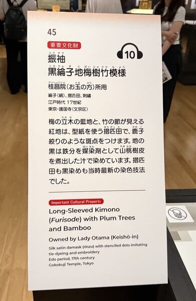 音声ガイドでボーナストラックとして冨永愛と対談をした東京国立博物館・学芸研究部調査研究課長の小山弓弦葉氏は、ほかの職員同様、着物姿で登場して、展覧会の内容、趣旨を説明した。夏用の黒留袖とのことで、昔は、黒留袖はもっとも格式の高い礼装だった。
