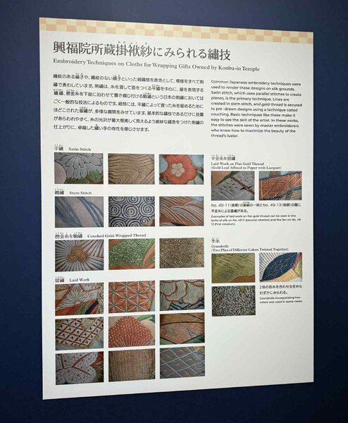「綱吉が側室・瑞春院(お伝の方)へ、年始や歳末、五節供など年中行事の祝い事にあわせた贈り物に掛けられていた袱紗31枚(重要文化財、前期・後期で全点展示)はお見逃しなく。元禄期の美しい刺繍が施された一級品で、非常に貴重な機会でございます」