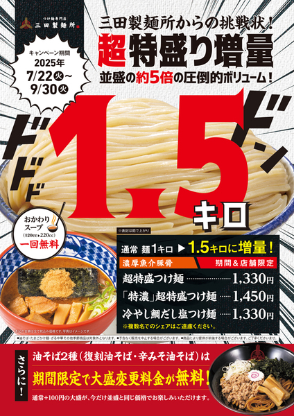 「超特盛り増量キャンペーン」では、通常1kgの麺量(茹で上がり後)で提供している“超特盛”つけ麺を、夏季限定でなんと1.5kgに増量して提供します。