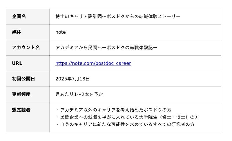 大学院生・研究者のキャリア支援を行う株式会社アカリク(本社:東京都渋谷区、代表取締役:山田 諒)は、このたび、ポスドク(※)から民間企業へ転職した方の体験談をまとめたnote連載企画「博士のキャリア設計図~ポスドクからの転職体験ストーリー」の運用を2025年7月18日より開始いたしましたのでお知らせします。