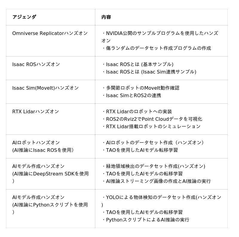 「ROBODEV」は、ジーデップ・アドバンスが提供する高性能で動作検証済みのGPUワークステーションに、AIロボット開発に必要な環境構築をセミオートで行えるROBODEVインストーラーを実装しており、フィジカルAI開発向けのNVIDIAプラットフォームであるNVIDIA Isaac(TM) (NVIDIA Isaac Sim(TM)、NVIDIA Isaac ROS)やNVIDIA Omniverse(TM) などを、簡単にセットアップすることが可能です。加えてセットアップ後には、マクニカよりAIロボット開発導入支援に向けたハンズオンサポートを用意しており、NVIDIA Isaacの座学やNVIDIA Isaac Simの基本操作をレクチャーします。