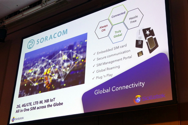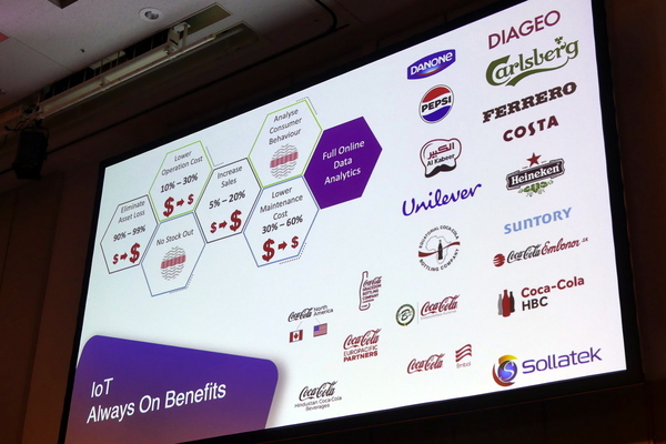 フロコス氏はギリシャから来たが、Sollatekは40年の歴史を持つイギリスの会社だ。100名のスタッフのほとんどはエンジニアで、IoTデバイスを設計と開発を行なっている。自動販売機やコーヒーメーカー、冷蔵庫などにデバイスを搭載し、温度管理やリモートメンテナンス、顧客の属性分析などを実現。顧客もコカコーラ、ペプシ、ハイネケン、ユニリーバなど名だたる企業が名を連ねている。現在は20種類近くのデバイスを提供しているが、現在は世界中にデプロイされている約40万台がSORACOMを利用しているという。