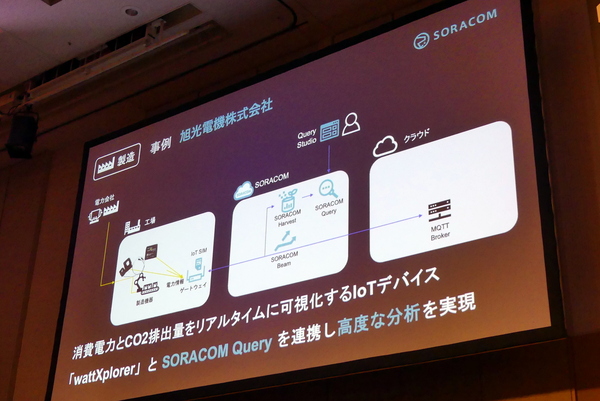 松井氏は、「データをどうやって効率よくDWHに入れるのか、入れた後にどのように既存のサービスと連携させるのか、どうやって活用するかを考えるのは頭が痛い問題。こういった悩みを解決するのがプラットフォーマーの役割だと思った」とコメント。この解決の一助となるのが、生成AIを導入したSORACOM Queryの役割。消費電力とCO2排出量をリアルタイムに可視化する「watXplorer」というサービスを展開している旭光電機は、SORACOM Queryとの連携でより高度な分析を実現している。