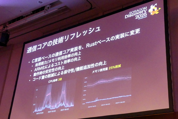 通信コアの技術リフレッシュも実施した。10年前に構築したC言語ベースの通信コアをRustベースに変更し、すでに一部で利用しているという。実測値ではCPUの利用効率は3倍に上がり、メモリの利用量も25%削減。ARM化によりコスト効率も高まり、Rustを採用することで、動作の安定性にも寄与しているという。