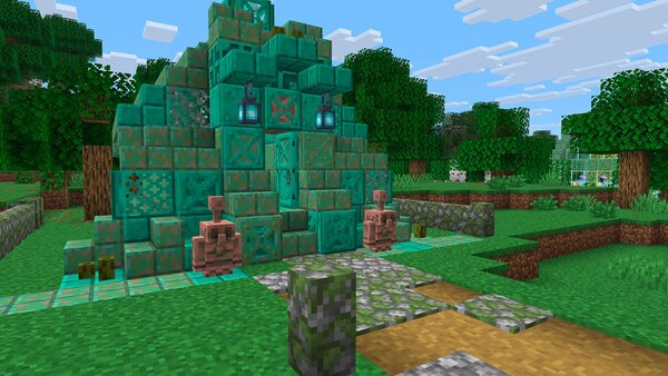 また、置物としてだけでなく、レッドストーン回路にも利用できる銅ゴーレム像の追加にも注目ですね。斧を使って、銅ゴーレムにいつでも戻せるのもうれしいところです。