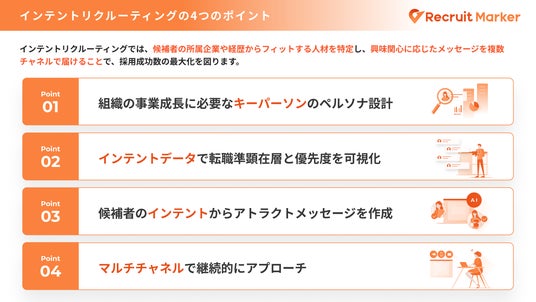 候補者のインテント(実現したいキャリア)に基づき、最適なタイミングとチャネルで自動アプローチを行うリクルーティングのAIエージェントです。候補者一人ひとりの関心や志向に応じて、パーソナライズされた精緻な採用アプローチを実現します。『Recruit Marker』は、「インテントリクルーティング4つのポイント」を通じて、誰よりも早く“隠れた優秀層”を見極め、最適なアプローチで出会いにつなげることを支援します。