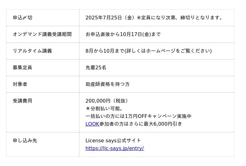 ※受講料一括払いの場合¥10,000引き、LOOK参加特典¥6,000引きとの併用可能。すべてご活用いただくと合計26,000円OFFとなります。