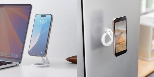 従来のスマホスタンドとは違い、固定部もマグネット吸着のため、冷蔵庫や金属フレームなど、磁力の働く場所であれば、さまざまな場所にピタッとくっつきます。