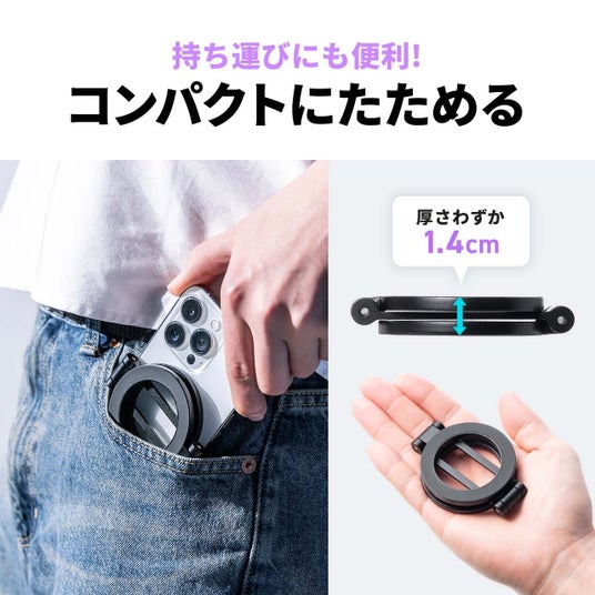 本製品は、MagSafe対応のiPhoneをマグネットで簡単に着脱できる両面マグネットスタンドです。