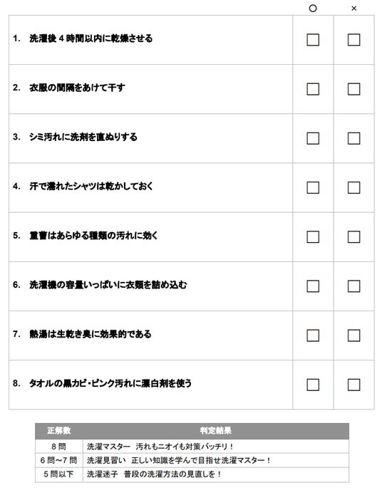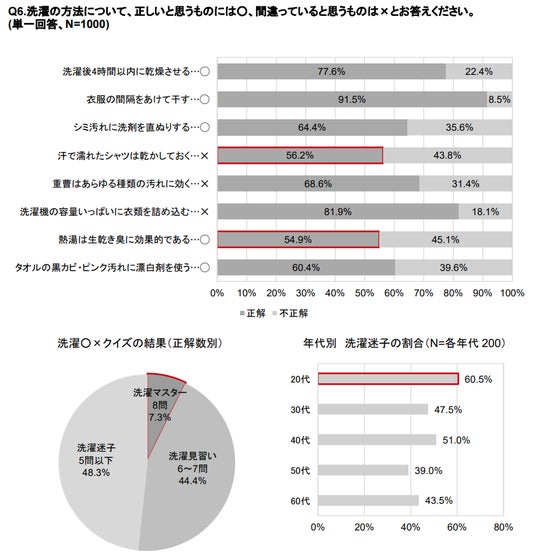 洗濯○×クイズの結果、全問正解の洗濯マスターは全体の7.3%でした。正答率が最も低い項目は「熱湯は生乾き臭に効果的である…○(54.9%)」、次いで「汗で濡れたシャツは乾かしておく…×(56.2%)」でした。