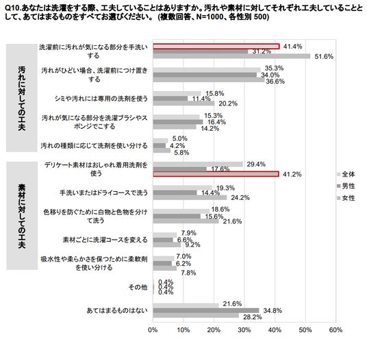 洗濯時の工夫について聞きました。衣類の汚れに対する工夫としては、「洗濯前に汚れが気になる部分を手洗いする(41.4%)」が最も多く、次いで「汚れがひどい場合、洗濯前につけ置きする(洗剤・漂白剤など)(35.3%)」でした。また、素材に対する工夫としては、「デリケート素材はおしゃれ着用洗剤を使う(29.4%)」が最も多い結果でしたが、男女別では、女性が41.2%、男性が17.6%と大きな差がありました。
