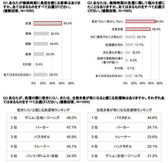 梅雨に負担を感じる家事1位「洗濯」 悩みは「乾きづらい」 生乾き臭が気になる1位「バスタオル」