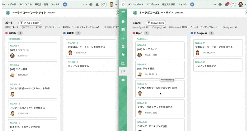 ボードで便利なのが、それぞれのカードをドラッグ&ドロップで移動することができる点です。カードを移動するだけで、課題の詳細画面を開かなくても、状態を変更する(たとえば「未対応」から「処理中」へ)ことができます。個々のカードが左から右へ動いていけば、プロジェクトが進捗しているということですね。