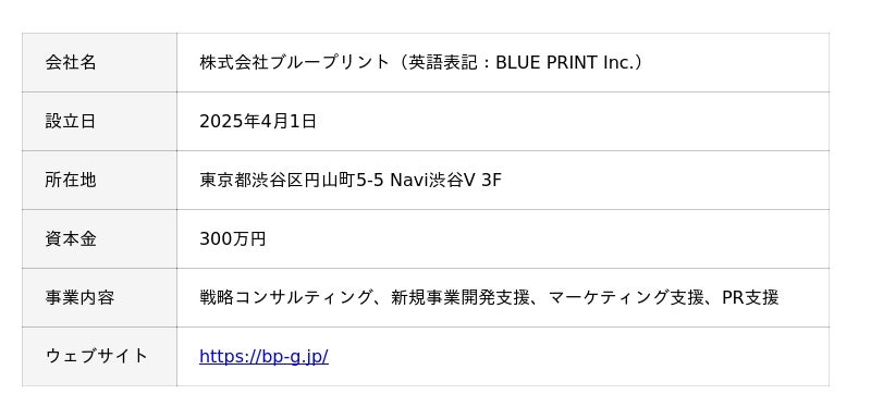 この度、株式会社ブループリント(本社:東京都渋谷区、代表取締役:大江 隆允)を設立いたしましたのでお知らせ申し上げます。