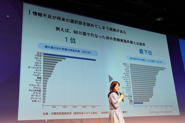 日本人は、月経や生殖の知識が著しく低いという。東尾氏は、「『子供っていつでも授かれるんじゃないの』『妊娠適齢期なんて知らなかった』という、かつての私の声は、不妊治療をしている人達の声でもあった」と支援活動を振り返る。この状況はデータにも表れており、日本における不妊治療の実施件数は他国と比べて飛びぬけて多い一方、不妊治療による出生率は最下位という状況に置かれている。