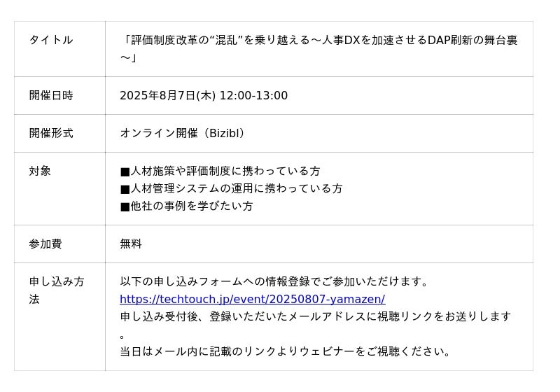 お申し込みはこちら:https://techtouch.jp/event/20250807-yamazen/