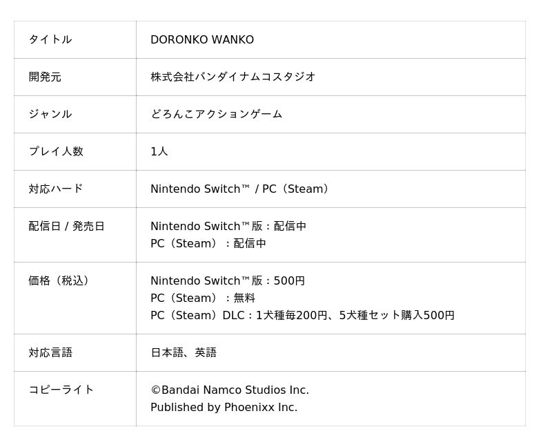 株式会社Phoenixx(フィーニックス)(東京都武蔵野市、代表取締役社長:坂本 和則)と、株式会社バンダイナムコスタジオ(東京都江東区、代表取締役社長:内山 大輔)は、インディーゲームレーベル「GYAAR Studio(ギャースタジオ)」によりSteam版が開発された『DORONKO WANKO』について、本日2025年7月24日(木)よりNintendo Switch(TM) 版が配信開始されたことをお知らせいたします。Nintendo Switch(TM) 版に合わせ、新たに5つの犬種が登場します。また、Steam版のDLCにつきましても同様に配信開始されました。