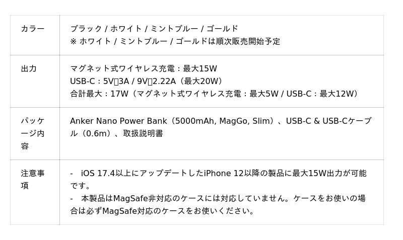 米国・日本・欧州を中心にデジタル関連製品でトップクラスの販売実績を誇るAnkerグループの日本法人、アンカー・ジャパン株式会社(本社:東京都千代田区、代表取締役CEO:猿渡 歩)は、世界No.1モバイル充電ブランド(※)の「Anker」において「Anker Nano Power Bank(5000mAh, MagGo, Slim)」を2025年7月24日(木)よりAnker Japan 公式オンラインストア(製品ページ:https://www.ankerjapan.com/products/a1665)、直営店 Anker Store、総合オンラインストアAmazon.co.jp(製品ページ:https://www.amazon.co.jp/dp/B0F6LBT3ZX)、楽天市場(製品ページ:https://item.rakuten.co.jp/anker/a1665/)および一部家電量販店等にて販売開始いたします。