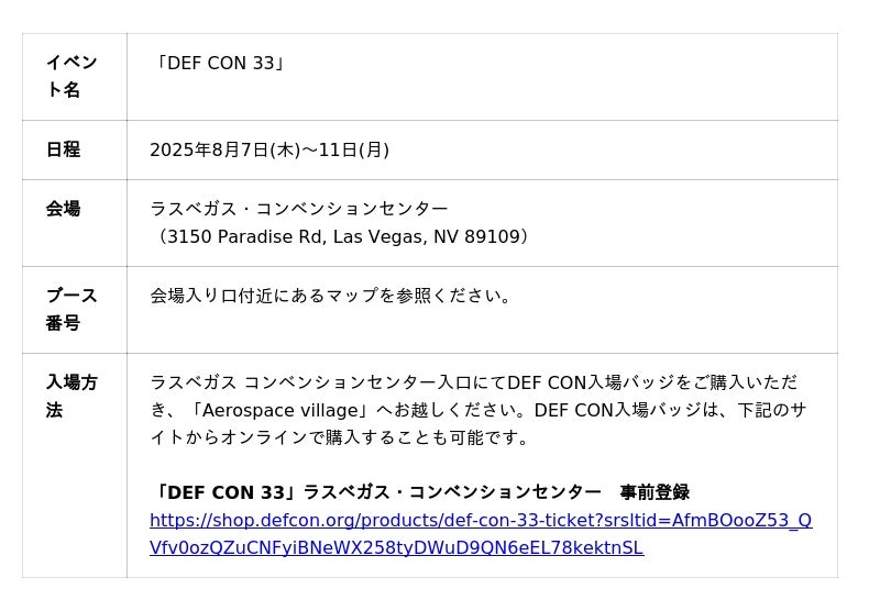 GMOインターネットグループでサイバー攻撃対策事業を展開するGMOサイバーセキュリティ byイエラエ株式会社(代表取締役CEO:牧田 誠 以下、GMOサイバーセキュリティ byイエラエ)は、2025年8月7日~8月11日にアメリカ・ラスベガスで開催される、世界有数のセキュリティカンファレンス「DEF CON 33」の「DEF CON Aerospace Village」にて、アジア企業として初めて、宇宙サイバー領域に関するブースを出展いたします。