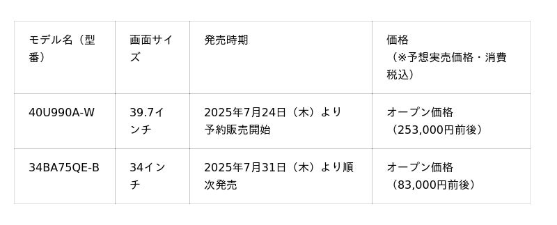 LGエレクトロニクス・ジャパン株式会社(代表取締役:孫 成周(ソン・ソンジュウ) 本社:東京都中央区)は、21:9曲面型ウルトラワイド(TM)モニターの新モデルとして、LG UltraFine(TM) Displayから39.7インチの「40U990A-W」と、LG UltraWide(TM) Monitorから34インチ「34BA75QE-B」を発売します。「40U990A-W」は、本日2025年7月24日(木)よりLG公式オンラインショップにて先行予約販売を開始し、「34BA75QE-B」は2025年7月31日(木)より順次発売します。なお、「40U990A-W」は、先行予約販売限定価格として17%オフでお求めいただけます。
