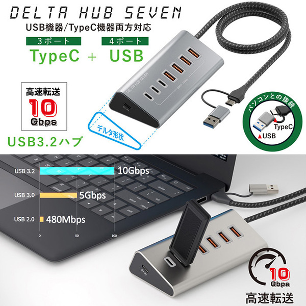 「DELTA HUB SEVEN」は、USB3.0の2倍、USB2.0の約20倍にも高めた最大10Gbpsの超高速データ転送を実現します。これにより、高画質な動画ファイルや大量の写真データもスムーズに転送できます。3つのType-Cポートと4つのUSBポートを搭載し、合計7つのポートで、複数のデバイスを一度に接続可能です。