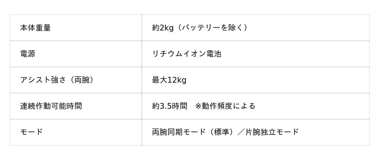 バッテリーとモーターを内蔵したリュック型の本体を背負い、肩から伸びたワイヤーを手首に装着。指先のセンサーによって荷物の保持を検知し、モーターがワイヤーを巻き上げることで、荷物を引き上げます。最大12kgのアシストを行い、上腕の負担を軽減。
