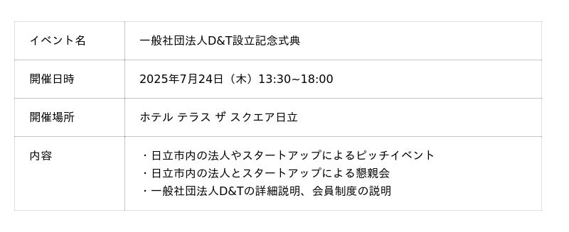 日立市の高度な技術とスタートアップの若い力が交わるイノベーション拠点の構築を目指す、『一般社団法人D&T設立記念式典』を2025年7月24日に開催