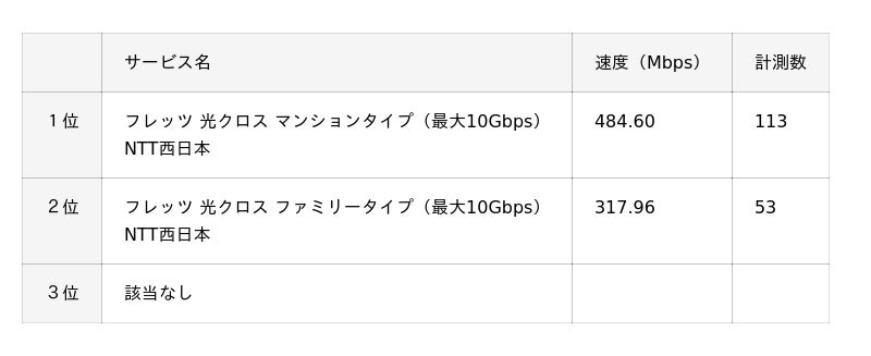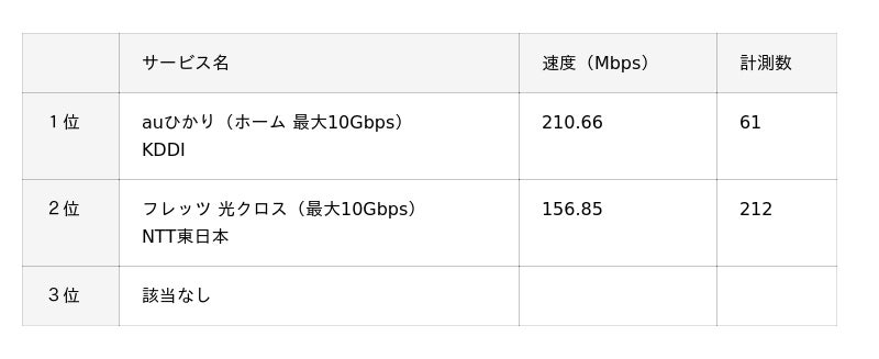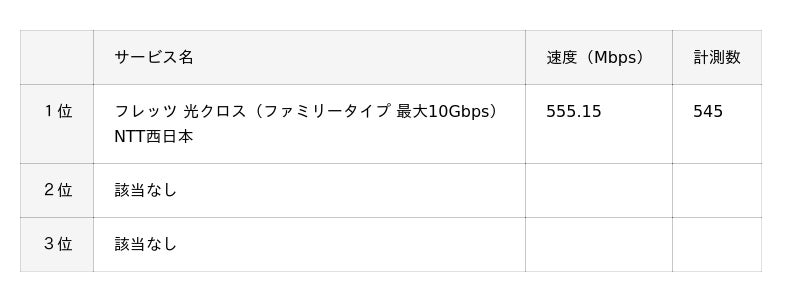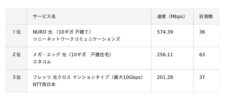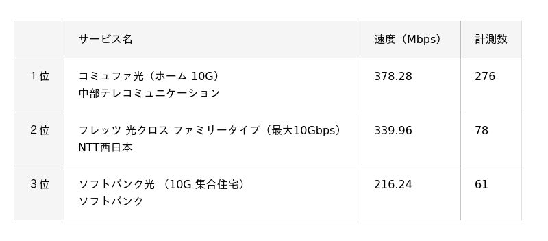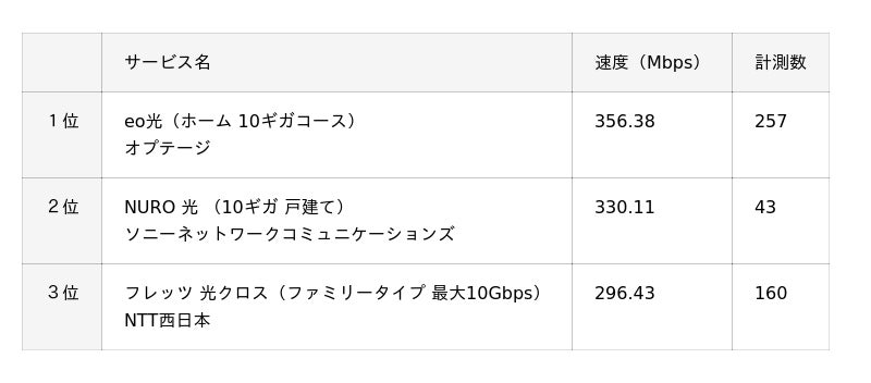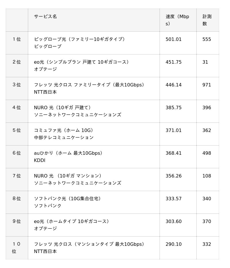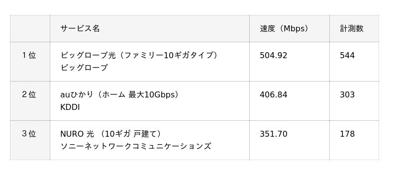 最も高い平均速度を示したのは「ビッグローブ光(ファミリー10ギガタイプ)」で、記録値は501.01 Mbpsとなり、前回に引き続き2ヵ月連続で1位を獲得しました。2位は「eo光(シンプルプラン 戸建て 10ギガコース)」の451.75Mbpsで、3位には「フレッツ 光クロス(ファミリータイプ 最大10Gbps)」(NTT西日本)が446.14Mbpsで入り、5月時点から大幅に順位を上げています。