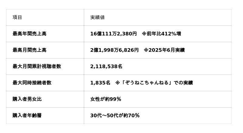 2022年頃からは「TikTok LIVE」と自社ECサイトを組み合わせる形でライブコマースを展開。商品選定・仕入れ、集客、ライブ企画・販売、発送、アフターフォローまでを一気通貫で設計・運営する仕組みを構築し、消費者にとって利便性の高い購買体験を提供しています。ライブコマースチャンネル「ぞうねこちゃんねる」「アヒルのライブマーケット」の合算での月商は2025年6月に過去最高の約2.2億円、2025年6月期の年商は前年比412%増加の約16億円を達成しており、「TikTok LIVE」を活用したライブコマースの実績を着実に積み上げています。2026年6月期には、年商約50億円を目指しています。