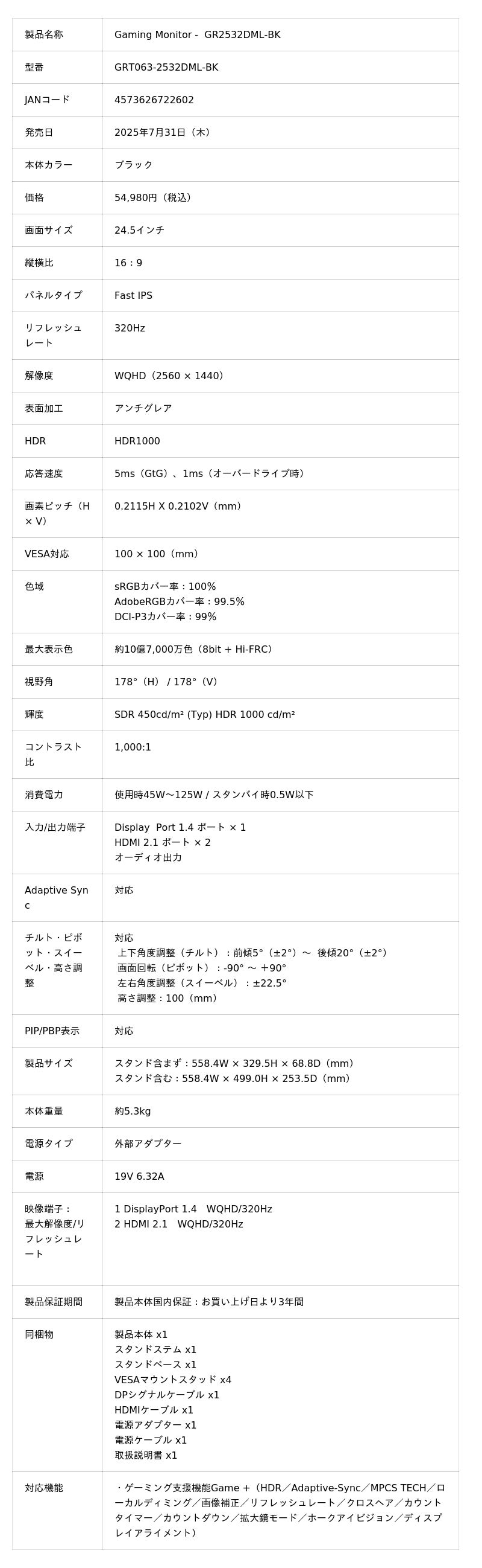 この度、毎日の当たり前をアップデートする『GRAPHT STANDARD』シリーズより、次世代の残像低減機能を搭載したQD-Mini LEDパネル採用、リフレッシュレート320Hzの、FPS/TPSなどの競技性の高いゲームでの優位性を大きく追求したゲーミングモニター『Gaming Monitor(GR2532DML-BK)』を2025年7月31日(木)に発売いたします。発売に先駆け、本日7月25日よりGRAPHT OFFICIAL STORE(ECサイト)および全国の家電量販店、PC専門店等にて先行予約販売を開始いたしました。