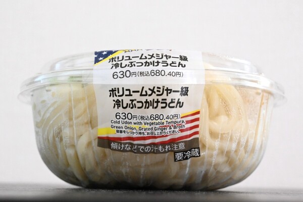 不思議なことに、セブンで見つけた時、近くには他にもお客さんがいたのですが、誰ひとりこの巨大な冷しぶっかけうどんに気づいた様子ではなかったんですよ。すぐ近くの棚に「とみ田監修 濃厚豚骨魚介 冷しつけ麺」が鎮座していて、そちらに気をとられていたのかもしれません。