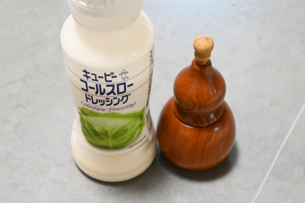 そしてここまでボリューミーだと、どうしても途中で味が単調になってきます。そんな時には家にある調味料で味変したいもの。ナベコのオススメはコールスロードレッシングと七味唐辛子のダブルちょい足しです。